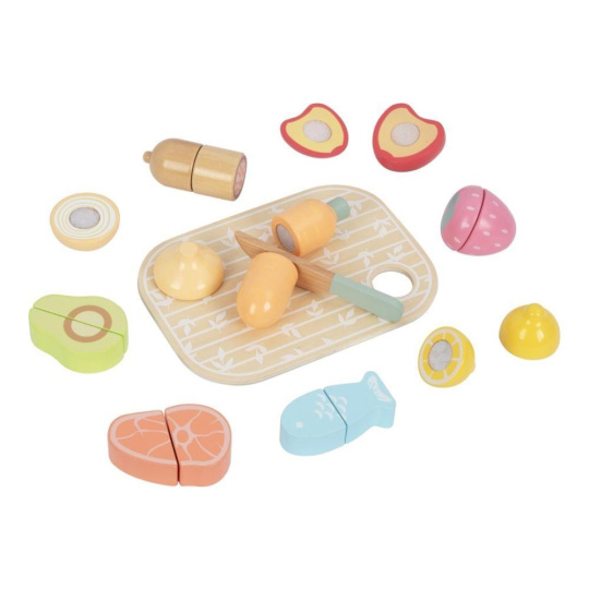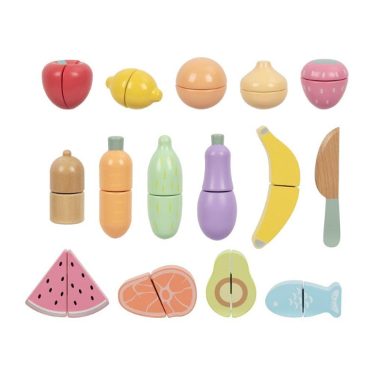 Sada dřevěných krájecích potravin uložená v praktickém a snadno přenosném boxu 3v1 umožní dětem přichystat hostinu doma i na návštěvě. Krájecí ovoce, zeleninu a další potraviny mohou děti pomocí dřevěného nože krájet (porcovat) na poloviny a pomocí suchého zipu poloviny opět spojovat. S krájecími potravinami si děti vyzkouší krájení bezpečným dětským způsobem a zdokonalí své dovednosti..