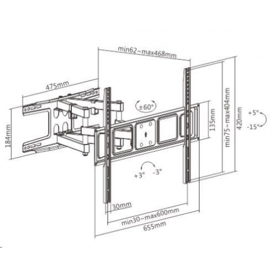 Kvalitní nástěnný držák na televizi Fiber Mounts Solid-2    Otočný, sklopný, výsuvný držák Tv 43-85" s pevnou a bezpečnou konstrukcí     Držák vhodný pro zavěšení televize na stěnu do obýváku, pokoje nebo kanceláře. Držák Tv Fiber Mounts Solid-2 se vyznačuje kvalitní robustní konstrukcí s velkou nástěnnou plochou pro spolehlivou instalaci a umožňuje poměrně snadnou úpravu polohy televize otáčením do stran, naklápěním a vysouváním nebo naopak přisouváním ke zdi. V případě nerovností nebo nepřesné instalace držák umožňuje korigovat rovinu obrazovky. Na držák Solid-2 můžete zavěsit všechny televize s hmotností do 40kg, které mají VESA od 100x100 do 600x400 - ideální jsou televizory s úhlopříčkou 43" až 85". Barevné provedení černé, záruka 5 let.     Držák na televizi, který vynikne opravdu solidní pevnou konstrukcí - otáčení Tv do stran, naklápění, vysouvání od zdi - Fiber Mounts Solid-2     Technické údaje:   nosnost 40kg podpora VESA standardů 100x100 až 600x400 ideální na Tv s úhlopříčkou 43" až 85" polohování vzdálenosti od zdi od 62mm do 468mm otáčení televizoru do stran +/- 60° naklápění televizoru směrem dolů až o 15° a nahoru až o 5° úprava roviny obrazovky +/- 3° úchytky na kabeláž robustní, spolehlivá a bezpečná konstrukce snadné zavěšení televizoru na stěnu snadné polohování televizoru snadná instalace na stěnu dodáváme včetně instalačního materiálu barevné provedení černé  záruka 5 let    Ocelový nástěnný držák poctivé konstrukce Fiber Mounts Solid-2     Televizní držák Fiber Mounts Solid-2 podporuje VESA standardy:   VESA 100x100 VESA 100x200 VESA 200x100 VESA 200x200 VESA 200x300 VESA 200x400 VESA 300x200 VESA 300x300 VESA 400x200 VESA 400x400 VESA 600x400.