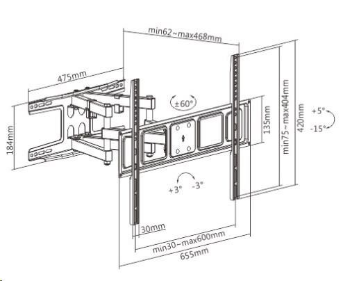 Kvalitní nástěnný držák na televizi Fiber Mounts Solid-2 Otočný, sklopný, výsuvný držák Tv 43-85" s pevnou a bezpečnou konstrukcí Držák vhodný pro zavěšení televize na stěnu do obýváku, pokoje nebo kanceláře. Držák Tv Fiber Mounts Solid-2 se vyznačuje kvalitní robustní konstrukcí s velkou nástěnnou plochou pro spolehlivou instalaci a umožňuje poměrně snadnou úpravu polohy televize otáčením do stran, naklápěním a vysouváním nebo naopak přisouváním ke zdi. V případě nerovností nebo nepřesné instalace držák umožňuje korigovat rovinu obrazovky. Na držák Solid-2 můžete zavěsit všechny televize s hmotností do 40kg, které mají VESA od 100x100 do 600x400 - ideální jsou televizory s úhlopříčkou 43" až 85". Barevné provedení černé, záruka 5 let. Držák na televizi, který vynikne opravdu solidní pevnou konstrukcí - otáčení Tv do stran, naklápění, vysouvání od zdi - Fiber Mounts Solid-2 Technické údaje: nosnost 40kg podpora VESA standardů 100x100 až 600x400 ideální na Tv s úhlopříčkou 43" až 85" polohování vzdálenosti od zdi od 62mm do 468mm otáčení televizoru do stran +/- 60° naklápění televizoru směrem dolů až o 15° a nahoru až o 5° úprava roviny obrazovky +/- 3° úchytky na kabeláž robustní, spolehlivá a bezpečná konstrukce snadné zavěšení televizoru na stěnu snadné polohování televizoru snadná instalace na stěnu dodáváme včetně instalačního materiálu barevné provedení černé záruka 5 let Ocelový nástěnný držák poctivé konstrukce Fiber Mounts Solid-2 Televizní držák Fiber Mounts Solid-2 podporuje VESA standardy: VESA 100x100 VESA 100x200 VESA 200x100 VESA 200x200 VESA 200x300 VESA 200x400 VESA 300x200 VESA 300x300 VESA 400x200 VESA 400x400 VESA 600x400.