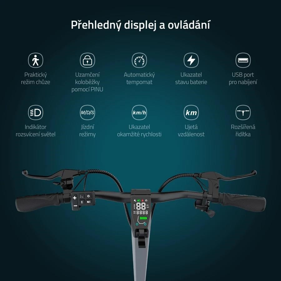 Všechny údaje o jízdě uvidíš za každého počasí nebo klidně i v noci na velkém LCD displeji, rozhodně ti proto neunikne, kolik šťávy zbývá nebo jakou máš rychlost. Hravě přes něj koloběžku pomocí 3místného PIN kódu i zabezpečíš proti krádeži. Jsou úseky, kde se můžeš kochat okolím a neřešit rychlost, tu hlídá tempomat. Když je rychlost konstantní, automaticky se aktivuje. Bezpečnou jízdu za jakýchkoliv podmínek podporuje LED osvětlení celé koloběžky, kdy díky LED světlu, bočním barevným světlům a zadnímu integrovanému budeš nepřehlédnutelný. Když s tebou jde kámoš a klábosíte nebo se ti nechce do prudkého kopce koloběžku tlačit, aktivuj Walking Mode, který popojíždí pomalým tempem max. 6 km/h. Koloběžka tě zachrání i tehdy, když máš vybitý mobil, stačí využít USB vstup pro nabíjení. Pokud potřebuješ svoji mašinu přenést nebo uskladnit, během 3 sekund ji pomocí inovativního mechanismu složíš. Jen počítej s tím, že váží 35 kg.