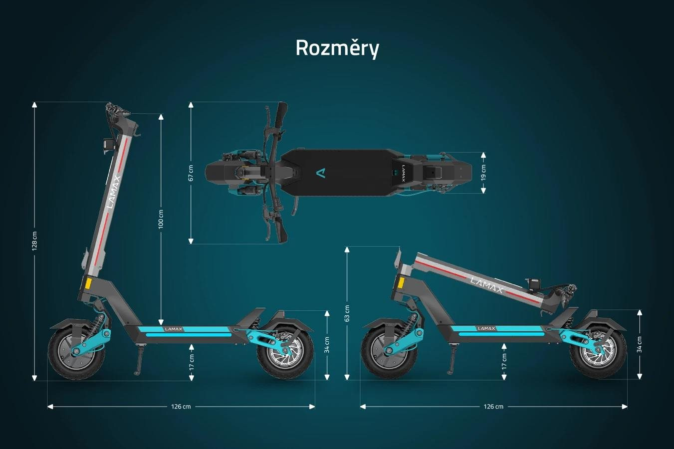 Rozměry (složená): 126 × 67 × 63 cm (délka, šířka, výška)