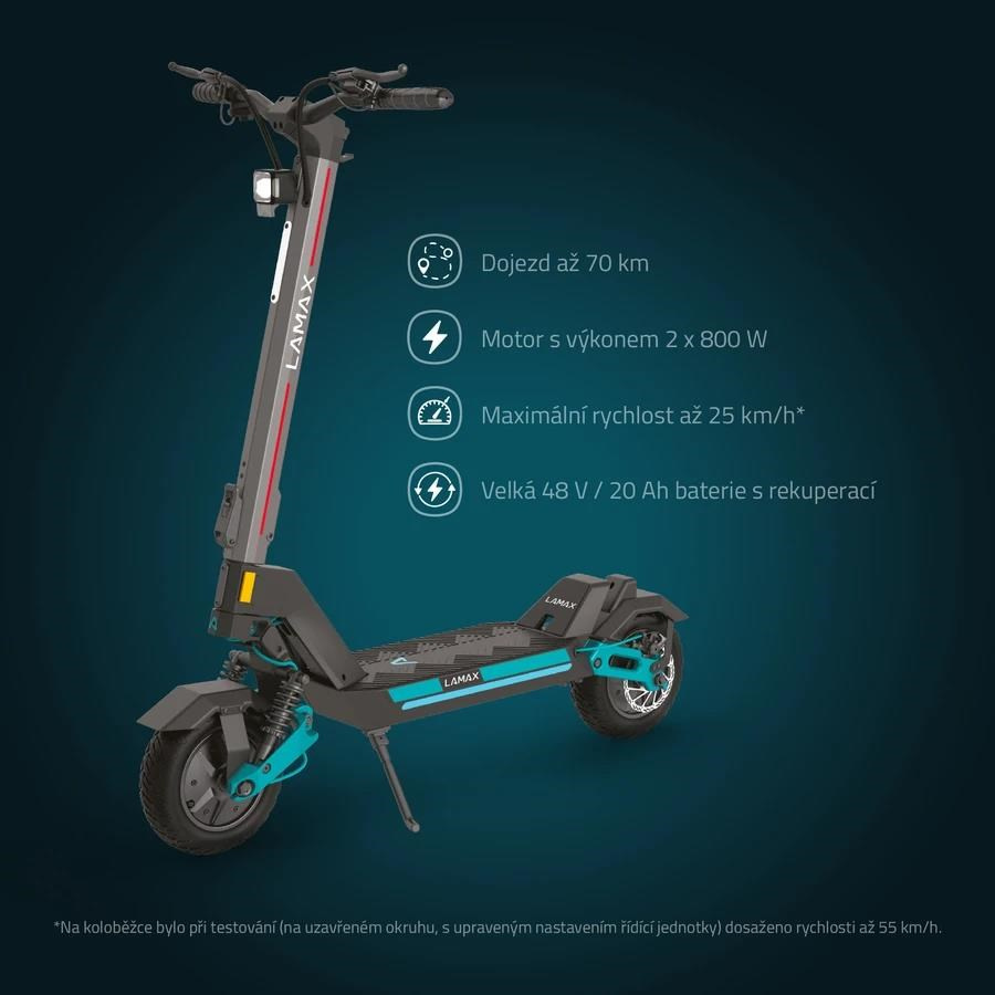 Užij si pořádnou jízdu, ať už vyrážíš do školy, práce nebo za zábavou. Elektrická koloběžka LAMAX eTank SA70 tě doveze rychlostí až 25 km/h klidně i 70 km daleko. Její moderní industriální design a 10,5palcové pneumatiky s?extra vyztuženým pláštěm odolným proti defektům a skvělou přilnavostí zvládnou každý terén. Díky přednímu i zadnímu odpružení se povezeš jako na obláčku a hezky stabilně. Opomenout nesmíme ani silné 2×800W motory s rekuperací. Svištět si to můžeš, i když nejsi žádný drobek, nosnost má koloběžka až 150 kg. Všechno, co potřebuješ vědět o svojí jízdě, ti ukáže velký přehledný LCD displej, včetně toho, který ze čtyř rychlostních stupňů a dvou výkonnostních režimů používáš. Bezpečnost zajišťuje ochrana proti nechtěnému rozjezdu a LED osvětlení celé koloběžky. Pevná konstrukce s velkou nášlapnou plochou se dá snadno a rychle složit a koloběžka má i parádní zabezpečení proti nenechavcům.