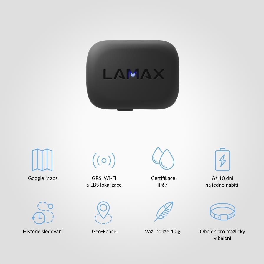 Pohlídejte si své mazlíčky, kufry na dovolené nebo další movité věci. LAMAX GPS Locator je malý, GPS vysílač, který díky silné baterii vydrží až 10 dní bez nabíječky a s voděodolností IP67 mu nevadí ani déšť. Jeho používání vám dodá klid, že vše, na čem vám záleží, je na svém místě. A když náhodou ne, s přesným určením polohy to ve vychytané mobilní aplikaci LAMAX Tracking najdete raz dva.