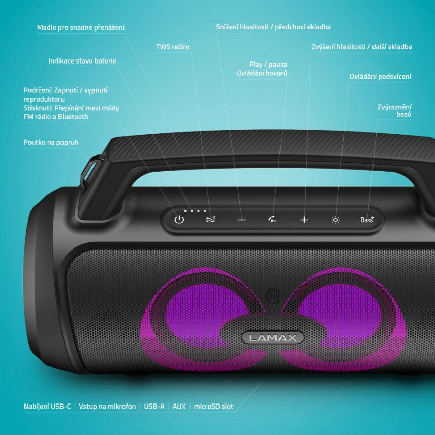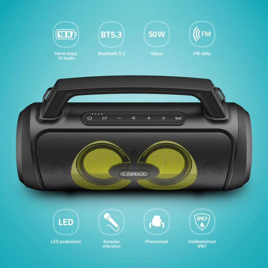 Udávej tón každé party s přenosným reproduktorem LAMAX PartyGo1 Play. Jeho nevelké tělo s šikovným madlem ukrývá značný výkon 50 W. Kdekoliv si jen vzpomeneš, naservíruje ti silný, plný a bohatý zvuk díky technologii BeatBass®. Ať už se jedná o pořádnou party nebo zahradní grilovačku, vždy jim dodají ten správný vibe i 3 režimy LED podsvícení a přibalený mikrofon, s nímž si užiješ super karaoke nebo můžeš akci moderovat. Bluetooth 5.3 zařídí okamžité spárování repráku s jakýmkoliv zařízením a jistotu bezchybného přenosu až na 18 m. Připojit ho lze ale i přes USB, microSD, případně AUX a umí se proměnit v powerbanku přes USB-A vstup. Pořádnou muziku si užiješ i na cestách, baterie repráku vydrží až 15 hodin a díky praktickému popruhu si ho pohodlně hodíš přes rameno. Pokud je jeden reprák málo, pomocí True Wireless technologie ho pohodlně spáruješ s dalším. Nemáš zrovna při ruce svůj playlist? Využij FM rádio, který snadno naladíš. Reproduktor podporuje hlasové asistenty a ovládneš s ním i telefonní hovory.