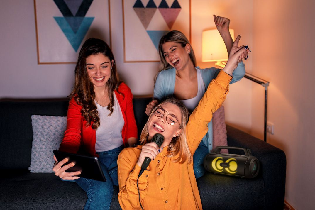 Ovládněte každou party. Součástí balení reproduktoru je mikrofon umožňující moderování nebo organizaci karaoke, kdy si můžete zazpívat se svými idoly. Hlasitost si snadno nastavíte.