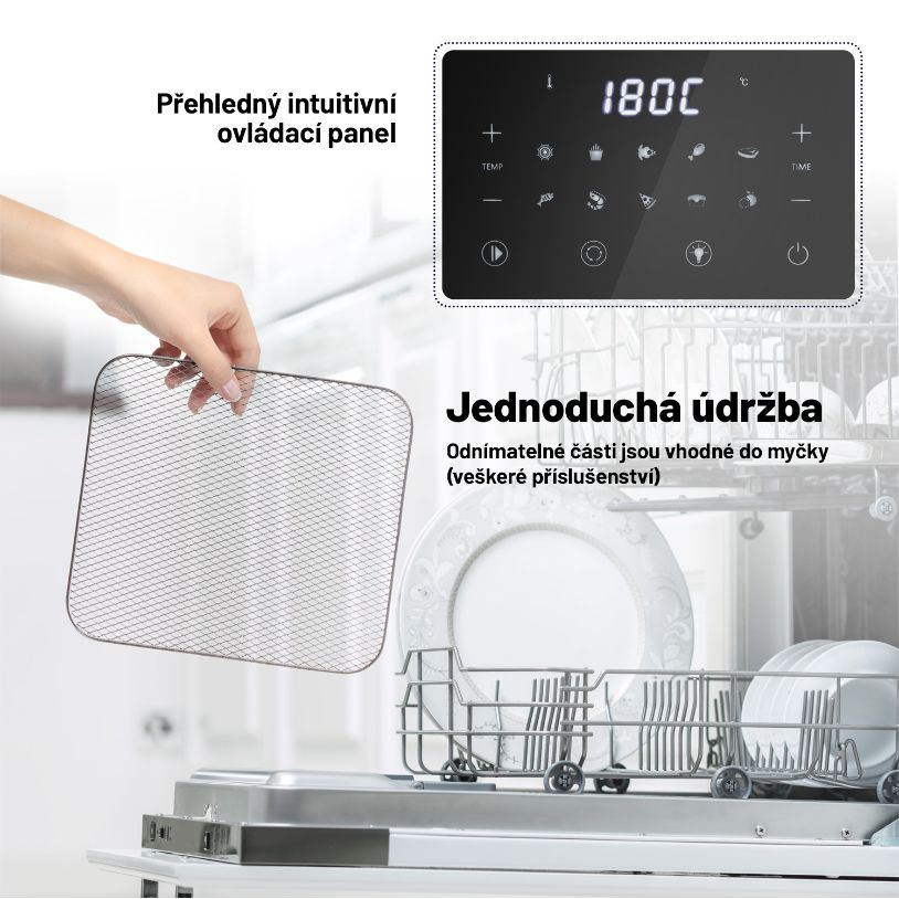 Lauben Hot Air Fryer Oven 1500SB funguje na principu 360° cirkulace horkého vzduchu, který jídlo ohřívá ze všech směrů, a není tak třeba použít téměř žádný olej. Díky pachovému filtru můžete na nevábnou vůni, která běžně doprovází smažení a pečení, klidně zapomenout. Troubu jsme navíc vybavili digitálním dotykovým displejem, na kterém si můžete zvolit buď jeden z přednastavených programů, nebo manuálně nastavit teplotu a čas přípravy. Jak je u nás zvykem, v základním balení najdete kompletní výbavu.