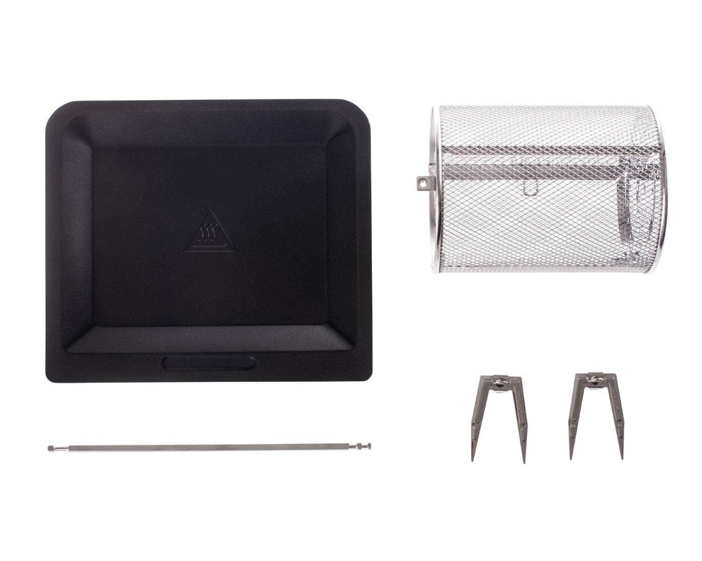 1 klasická mřížka na plech nebo různé formy, 1 rotační koš na hranolky, 1 hlubší mřížka na pečení kuřecích křídel, brambor, 1 plochá mřížka na sušení ovoce či hub, 1 odkapávací plech, který zachycuje tuk a olej, jehla na rožnění celého kuřete, úchyt.