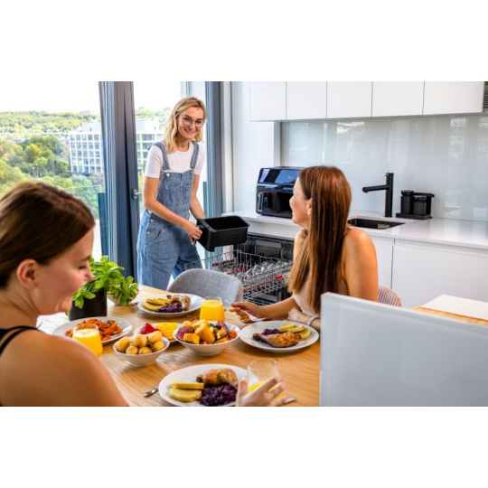 Horkovzdušná fritéza s dvěma koši, celkový objem 8 l, individuální nastavení obou košů zvlášť, možnost přípravy hlavního jídla a přílohy naráz, osvětlení interiéru, průhledná okénka pro vizuální kontrolu pokrmu, 8 přednastavených programů, možnost manuální úpravy času a teploty, technologie Cool Touch a Dualzone®, fun... více