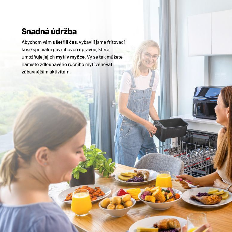 Horkovzdušná fritéza s dvěma koši, celkový objem 8 l, individuální nastavení obou košů zvlášť, možnost přípravy hlavního jídla a přílohy naráz, osvětlení interiéru, průhledná okénka pro vizuální kontrolu pokrmu, 8 přednastavených programů, možnost manuální úpravy času a teploty, technologie Cool Touch a Dualzone®, funkce předehřátí a synchronizované ukončení, přehledný dotykový displej, vnitřní tácy vhodné do myčky, prémiový matný design, 360° cirkulace horkého vzduchu, nastavitelná teplota: 80 – 200 °C, nastavení času 1 – 60 min, příkon 2700 W.