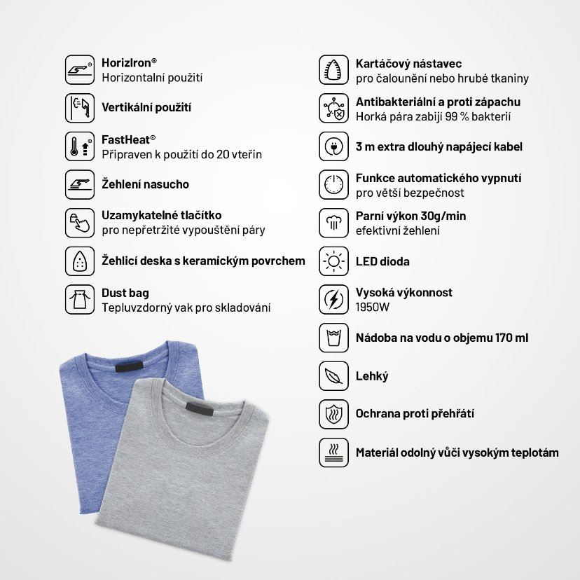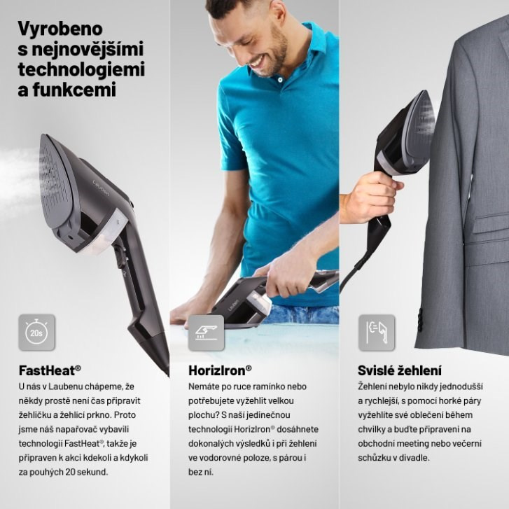 Není čas ztrácet čas, takže aby byl napařovač připraven ihned k provozu, je tady technologie FastHeat®. Díky ní je přístroj schopen akce do 20 sekund od zapnutí, ať jste kdekoliv. Někdy zkrátka není po ruce ani ramínko nebo je plocha tak velká, že klasické žehlení jde ze hry. Pak nastupuje technologie HorizIron®, s níž dosáhnete dokonalých výsledků i horizontálním napařováním či žehlením nasucho.