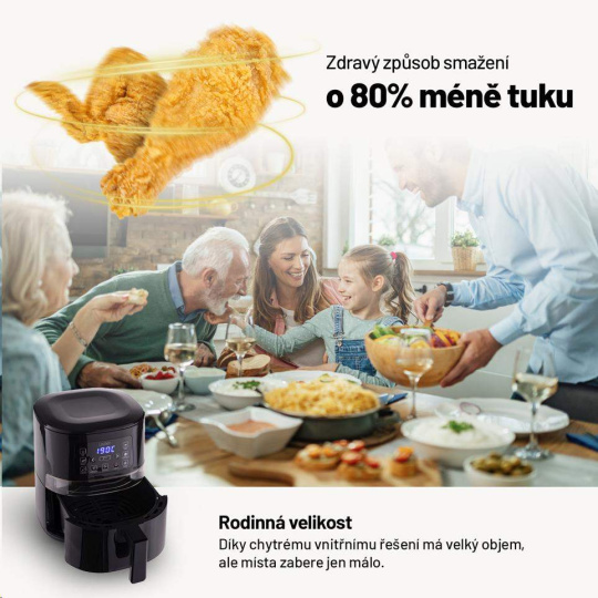 Horkovzdušná fritéza, objem nádoby 4l, průhledné okénko pro vizuální kontrolu pokrmu, osvětlení interiéru, příkon 1 600W, 8 programů vč. manuálního nastavení a předehřátí, digitální displej, vnitřní tác vhodný do myčky, 360° cirkulace horkého vzduchu, nastavitelná teplota: 120° - 200°, nastavení času 1 – 50 min.... více