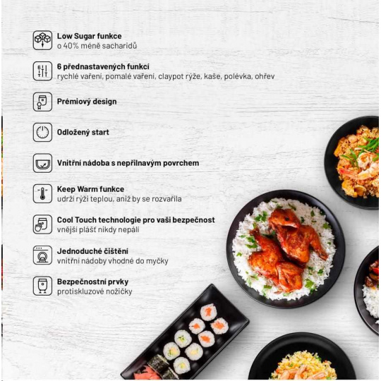 Rýžovar tvoří nádoba o objemu 1,5 litru s nepřilnavým povrchem. Příprava pokrmů tak nevyžaduje žádný přidaný tuk, a přesto se rýže ani ostatní suroviny nikdy nepřichytí. Velkou výhodou je i časovač a funkce keep warm, se kterými si můžete jídlo připravit předem nebo naopak držet několik hodin teplé, ale přitom stále perfektní. Ovládání zvládne úplně každý, vše si nastavíte na digitálním displeji, na kterém můžete sledovat průběh vaření. Potěší vás jistě i snadná údržba. Nádobu je možné mýt v myčce a vy tak nemusíte v kuchyni strávit celé odpoledne. Třešničkou na dortu je velmi povedený design, o kterém svědčí i dvě prestižní ocenění. Lauben Low Sugar Rice Cooker je ideálním pomocníkem do kuchyně právě pro vás, pokud chcete mít na talíři vždy perfektní výsledek, ale nechce se vám obětovat hodiny strávené u sporáku.