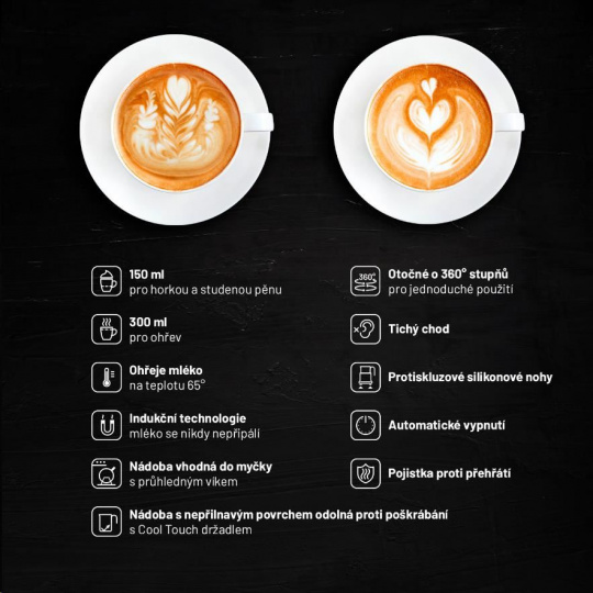 Pěnič mléka Lauben je vybaven funkcí automatického vypnutí a ochranou proti přehřátí. Nemusíte se tedy bát příliš vysoké teploty mléka nebo pěny. Díky indukční technologii ohřevu se mléko nikdy nepřipálí. Potěší vás jistě i možnost mytí v myčce nádobí a tichý chod, který oceníte hlavně po ránu.