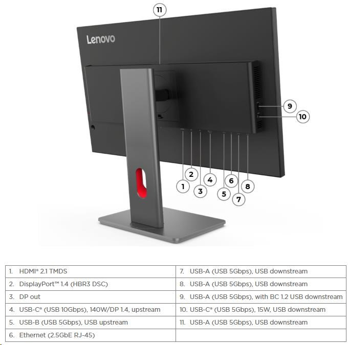| USB Port | 1x USB-C (USB 10Gbps,DP 1.4 Alt Mode HBR3, PD3.1 140W, USB upstream), 1x USB-B (USB 5Gbps, USB upstream), 3x USB-A (USB 5Gbps, USB downstream), 1x USB-A (USB 5Gbps, with BC1.2, USB downstream), 1x USB-C (USB 5Gbps, 15WPD, USB downstream) |