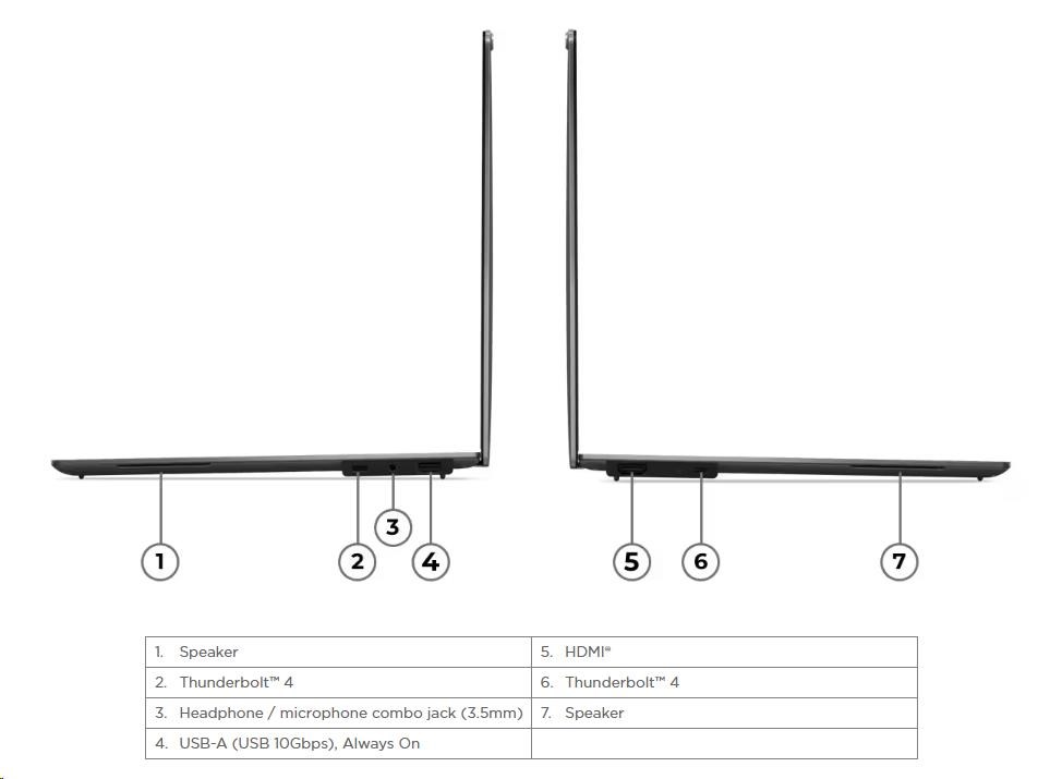 | Standartné porty | 1x USB-A (USB 10Gbps / USB 3.2 Gen 2), Always On 2x USB-C® (Thunderbolt™ 4 / USB4® 40Gbps), with USB PD 3.0 and DisplayPort™ 2.1 1x HDMI® 2.1, up to 4K/60Hz 1x Headphone / microphone combo jack (3.5mm) |