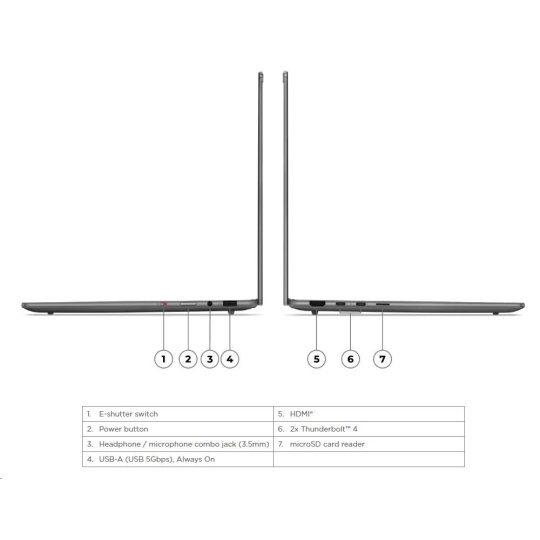 | Standartné porty | 1x USB-A (USB 5Gbps / USB 3.2 Gen 1), Always On 2x USB-C® (Thunderbolt™ 4 / USB4® 40Gbps), with USB PD 3.0 and DisplayPort™ 2.1 1x HDMI® 2.1, up to 4K/60Hz 1x Headphone / microphone combo jack (3.5mm) 1x microSD card reader |