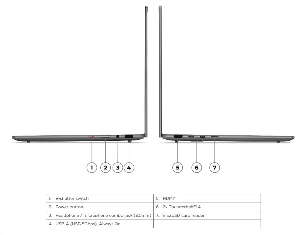 | Standartné porty | 1x USB-A (USB 5Gbps / USB 3.2 Gen 1), Always On 2x USB-C® (Thunderbolt™ 4 / USB4® 40Gbps), with USB PD 3.0 and DisplayPort™ 2.1 1x HDMI® 2.1, up to 4K/60Hz 1x Headphone / microphone combo jack (3.5mm) 1x microSD card reader |