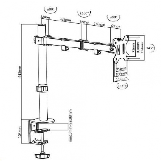 Levný kvalitní stolní držák monitoru Fiber Novelty F10 Otočný, sklopný, výškově i délkově nastavitelný držák monitoru 13-32", funkce PIVOT, 2 typy uchycení na stolovou desku, nosnost 8kg Levný, přesto kvalitní stolní držák pro uchycení LCD LED OLED monitoru s úhlopříčkou 13 až 32 palců. Po uchycení monitoru na držák oceníte zvětšený prostor na stole, monitor navíc můžete dle libosti otáčet do stran, naklápět, vysouvat a i výškově polohovat, monitor lze rotovat pro horizontální nebo vertikální otočení. Držák podporuje VESA standardy 75x75 a 100x100. Držák je možné zatížit monitorem s hmotností až 8kg. Ramena jsou osazena úchyty pro zafixování kabeláže. V balení naleznete 2 typy uchycení na stolovou desku, která může mít průměr 10mm až 88mm. Dodáváme v černé barvě, balení obsahuje potřebný instalační materiál. Levný držák na monitor 13-32 palců Fiber Novelty F10 splní požadavky i náročným zákazníkům, přitom za zlomek ceny jiných držáků na monitory. Otočný, sklopný, délkově a výškově stavitelný, funkce pivot, vedení kabeláže, 2 úchyty na stolové desky... Levný stolní držák na monitor do Vaší pracovny nebo kanceláře - plně nastavitelný, výborná kvalita - Fiber Novelty F10 Technické údaje: nosnost 8kg podpora VESA standardu 75x75 a 100x100 doporučujeme na monitory s úhlopříčkou 13 až 32" otáčení do stran +/- 360° náklon +/- 45° vysunutí monitoru až 421mm nastavení výšky, max. 420mm nastavení tuhosti chodu ramen uchycení na stolovou desku o průměru 10 až 88mm 2 typy uchycení na stolovou desku úchytky na kabeláž montážní materiál barva černá záruka 3 roky.