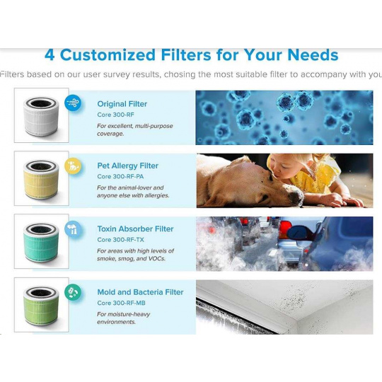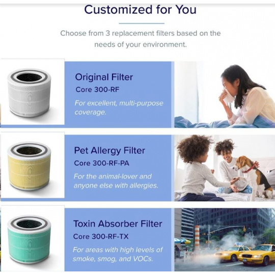Levoit CORE 300-RAC - čistička vzduchu Filtrace vzduchu probíhá ve 3 vrstvách. První je nylonový vnější filtr, který zachycuje nejhrubší částice jako prach, vlákna, části vlasů nebo chlupů. Druhou vrstvou je HEPA filtr H13. To odlišuje Levoit od konkurence, protože filtr HEPA H13 je mnohem kvalitnější a spolehlivější ... více