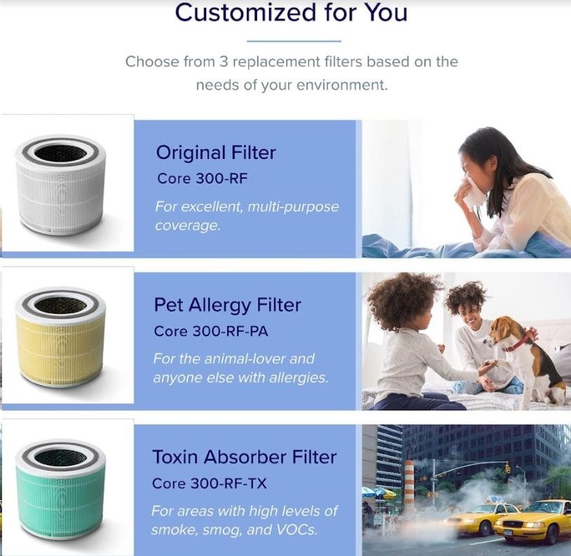 Levoit CORE 300-RAC - čistička vzduchu Filtrace vzduchu probíhá ve 3 vrstvách. První je nylonový vnější filtr, který zachycuje nejhrubší částice jako prach, vlákna, části vlasů nebo chlupů. Druhou vrstvou je HEPA filtr H13. To odlišuje Levoit od konkurence, protože filtr HEPA H13 je mnohem kvalitnější a spolehlivější ... více