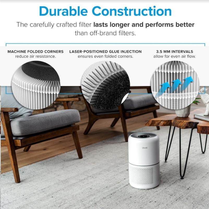 Druhou vrstvou je HEPA filtr H13. To odlišuje Levoit od konkurence, protože filtr HEPA H13 je mnohem kvalitnější a spolehlivější než běžně používané HEPA H11. Tu se odfiltrují jemné prachové částice, plíseň, bakterie, pyl, kouřové částice, roztoče a srst.