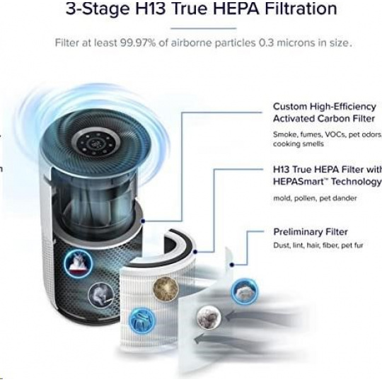 Vysoce kvalitní tří stupňový systém filtrace a HEPA H13 Filtrace vzduchu přebíhá ve 3 krocích. Prvním je nylonový vnější filtr, který zachycuje nejhrubší částice jako prach, vlákna, částky vlasů nebo chlupů. Druhou vrstvou je HEPA filtr H13. To odlišuje Levoit od konkurence, protože filtr HEPA H13 je mnohem kvalitnější... více