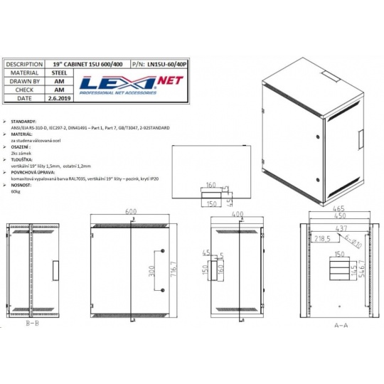 LEXI-Net 19" nástěnný rozvaděč 15U 600x450, nosnost 60 kg, plné dveře, svařovaný, šedý