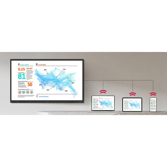 Bezdrátové sdílení obrazovky umožňuje prezentujícím volný pohyb po místnosti bez omezení kabely. Tato funkce jim umožňuje pohodlně ovládat prezentaci přímo ze svých zařízení. Navíc mohou snadno odesílat fotografie a videa uložená na svých osobních zařízeních, což zvyšuje plynulost a bohatost prezentací.