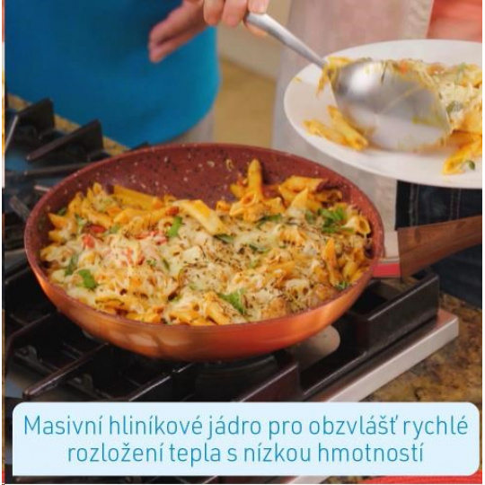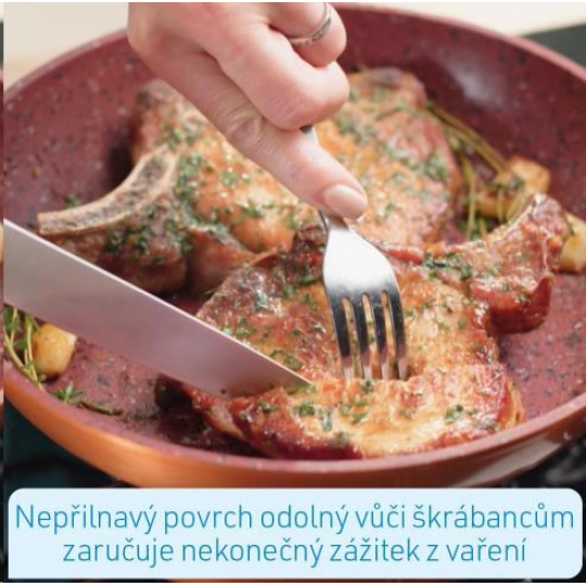 Zažijte i vy úžasný požitek s nejnovější generací pánví s nepřilnavým povrchem - Livington Copper & Stone Pan. Díky inovativní 7-vrstvé struktuře jsou dokonalé výsledky vaření ve vaší kuchyni od nynějška zaručené! Tajemství pánve spočívá v jejích vrstvách. Hliníkový trup je kombinován s extra silnou ocelovou vložkou. Jeho základem je robustní kamenný povlak pro nesrovnatelně dlouhou životnost a akumulaci tepla. Měď zušlechťuje kamennou vrstvu pro dokonalé rozložení tepla. Senzační složení pánve završují 3 vrstvy vysoce kvalitního nepřilnavého povlaku. Díky nepřilnavému povlaku odolnému proti poškrábání je zaručen skvělý zážitek z vaření, aniž se něco připálilo. Šťavnaté steaky, jemné ryby a křupavou zeleninu můžete připravit téměř bez tuku a oleje. Pevné hliníkové jádro vaší Livington Copper & Stone Pan zajišťuje extrémně rychlé a rovnoměrné zahřátí pánve s nízkou hmotností. Pánev je mimořádně robustní, odolná a snadno se čistí - stačí ji otřít hadříkem a je to hotové! Díky elegantnímu měděnému provedení se pánev stane absolutním poutačem pozornosti ve vaší kuchyni. Vaše pánev Livington Copper & Stone je vhodná pro všechny typy sporáků, jako jsou elektrické, keramické, plynové a indukční desky.