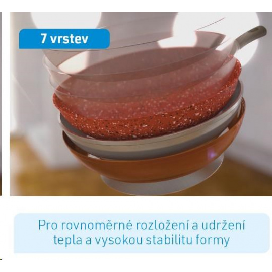 Tajemství pánve spočívá v jejích vrstvách. Hliníkový trup je kombinován s extra silnou ocelovou vložkou. Jeho základem je robustní kamenný povlak pro nesrovnatelně dlouhou životnost a akumulaci tepla. Měď zušlechťuje kamennou vrstvu pro dokonalé rozložení tepla. Senzační složení pánve završují 3 vrstvy vysoce kvalitního nepřilnavého povlaku.