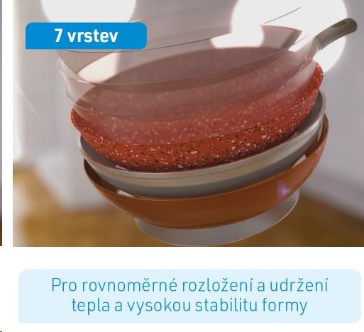 Tajemství pánve spočívá v jejích vrstvách. Hliníkový trup je kombinován s extra silnou ocelovou vložkou. Jeho základem je robustní kamenný povlak pro nesrovnatelně dlouhou životnost a akumulaci tepla. Měď zušlechťuje kamennou vrstvu pro dokonalé rozložení tepla. Senzační složení pánve završují 3 vrstvy vysoce kvalitního nepřilnavého povlaku.