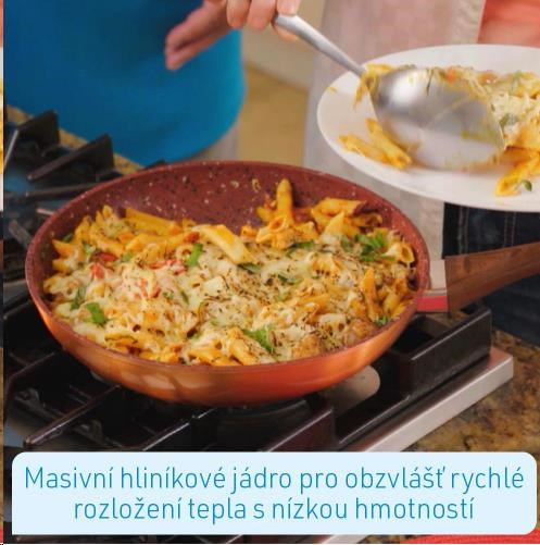 Zažijte i vy úžasný požitek s nejnovější generací pánví s nepřilnavým povrchem - Livington Copper & Stone Pan. Díky inovativní 7-vrstvé struktuře jsou dokonalé výsledky vaření ve vaší kuchyni od nynějška zaručené! Tajemství pánve spočívá v jejích vrstvách. Hliníkový trup je kombinován s extra silnou ocelovou vložkou. Jeho základem je robustní kamenný povlak pro nesrovnatelně dlouhou životnost a akumulaci tepla. Měď zušlechťuje kamennou vrstvu pro dokonalé rozložení tepla. Senzační složení pánve završují 3 vrstvy vysoce kvalitního nepřilnavého povlaku. Díky nepřilnavému povlaku odolnému proti poškrábání je zaručen skvělý zážitek z vaření, aniž se něco připálilo. Šťavnaté steaky, jemné ryby a křupavou zeleninu můžete připravit téměř bez tuku a oleje. Pevné hliníkové jádro vaší Livington Copper & Stone Pan zajišťuje extrémně rychlé a rovnoměrné zahřátí pánve s nízkou hmotností. Pánev je mimořádně robustní, odolná a snadno se čistí - stačí ji otřít hadříkem a je to hotové! Díky elegantnímu měděnému provedení se pánev stane absolutním poutačem pozornosti ve vaší kuchyni. Vaše pánev Livington Copper & Stone je vhodná pro všechny typy sporáků, jako jsou elektrické, keramické, plynové a indukční desky.