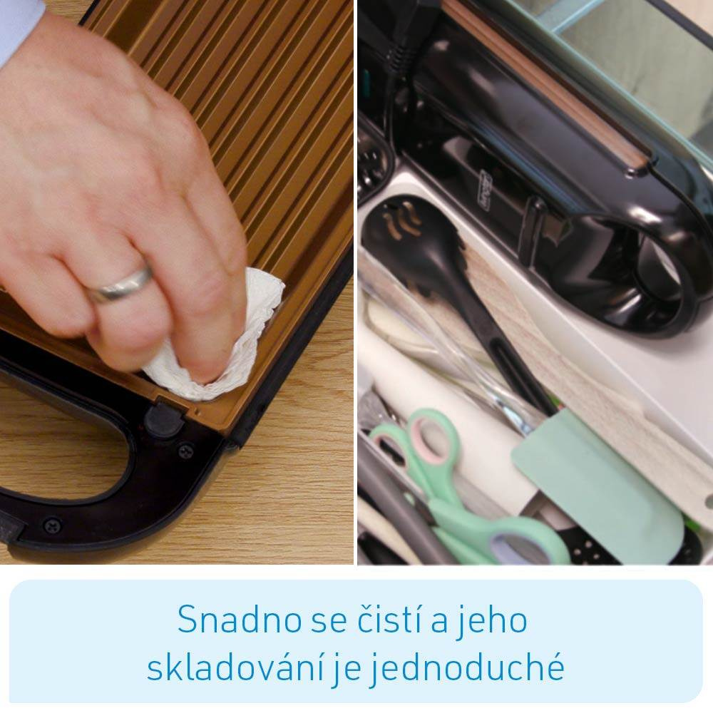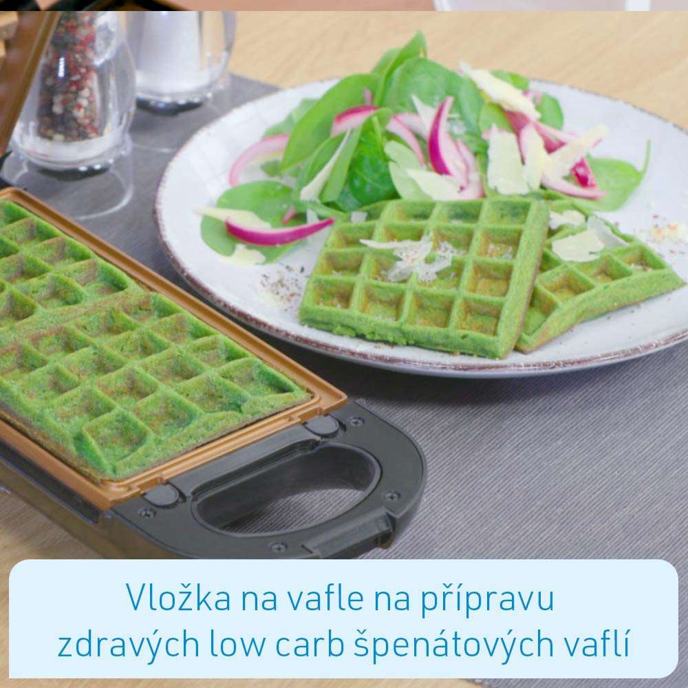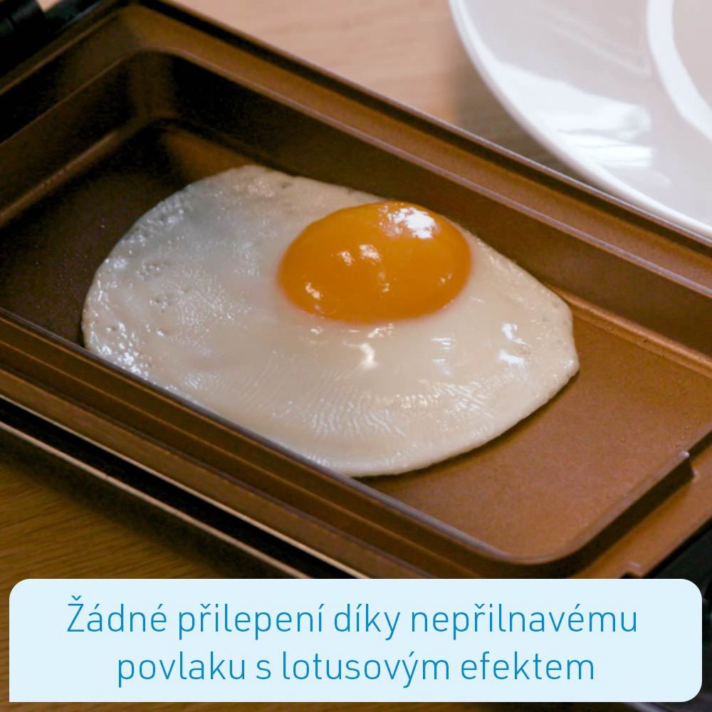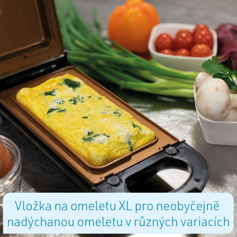 • Včetně 3 vyměnitelných vložek pro přípravu XL omelet, grilovaný specialit a vaflí