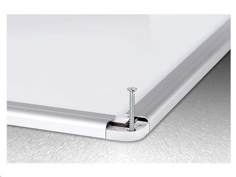 Magnetická tabule AVELI má bílý lakovaný povrch, elegantní rám z kvalitního eloxovaného hliníku, jehož součástí je praktická odkládací lišta na popisovače. Na tabuli je možné psát stíratelným fixem. Tabule má světle šedé plastové rohy, které zakryjí upevnění na zeď.
