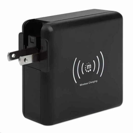 The Manhattan 4-in-1 Travel Wall Charger and Powerbank 8,000 mAh provides you with incredibly useful functions on one device. Use it as a USB wall charger to charge smartphones, tablets, eReaders, headphones and more from two USB-A and one USB-C port with per-port power up to 5 V / 2.4 A. You can also skip the wires altogether and charge compatible mobile devices on the 5 W wireless charging pad. For even more convenience, this all-rounder lets you charge on the go without plugging into a socket since it's also an 8,000 mAh powerbank. Its convenient digital number display lets you check the remaining battery at any time. Recharge the powerbank directly via AC on a power outlet or through its USB-C port. Finally, if you're an international traveler, you'll love its foldable US and swappable UK and EU plugs that let you charge devices in the many regions that offer these outlet types.