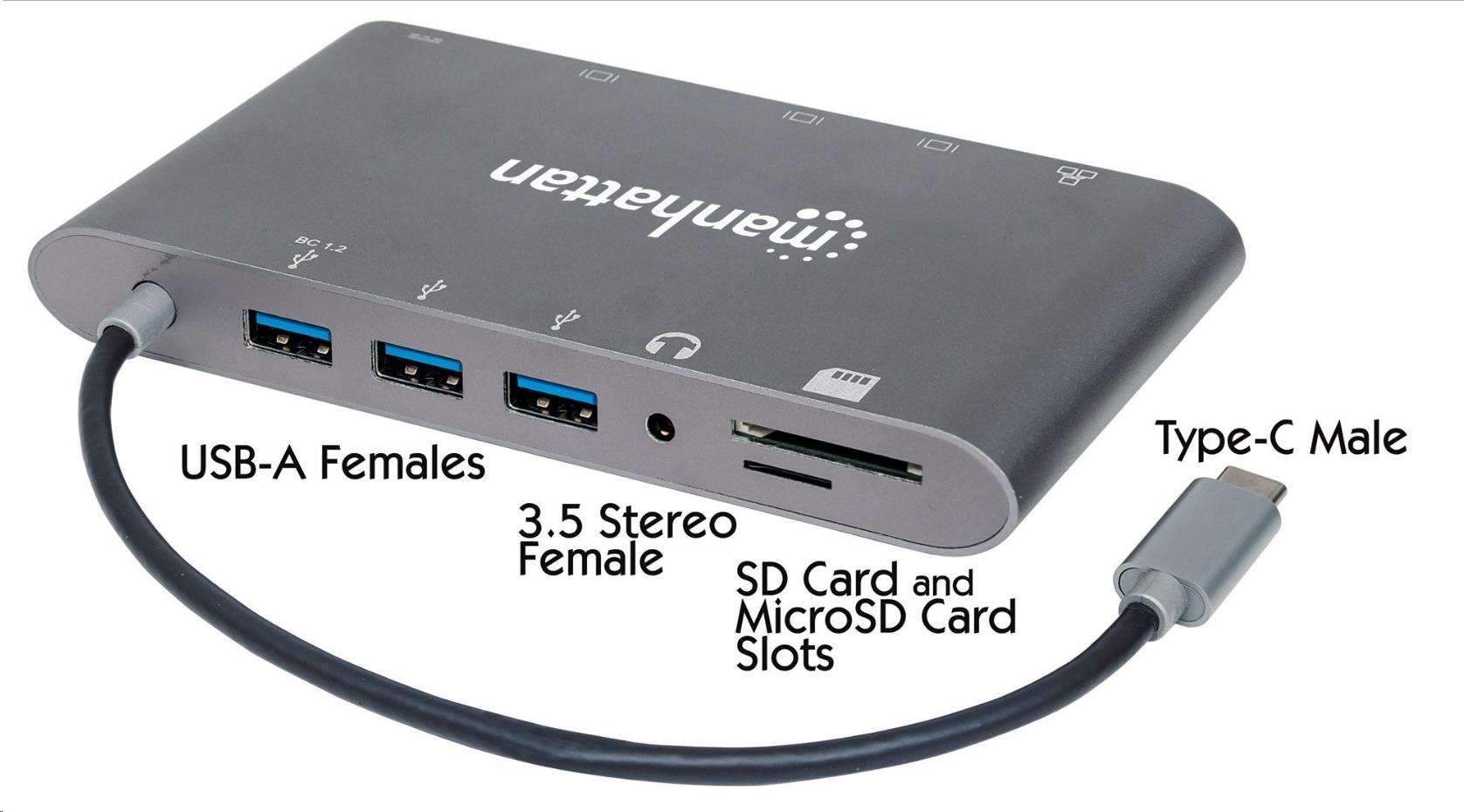 The Manhattan SuperSpeed USB-C to 7-in-1 Docking Station establishes a fast, simple and convenient link between newer USB Type-C-equipped media sources (computers, tablets, Smartphones, etc.) and an existing HDMI/Mini DP/VGA display (monitors, projectors, etc.), in either mirror- or extended-display mode. Create a mini-workstation by adding any USB 3.0 (and earlier) peripheral, such as a mouse, keyboard, hub, external memory device and more, with the integrated USB-A ports, Gigabit network connection, 3.5 mm Stereo and SD and Micro SD card slot, all while charging your device through the USB-C port.