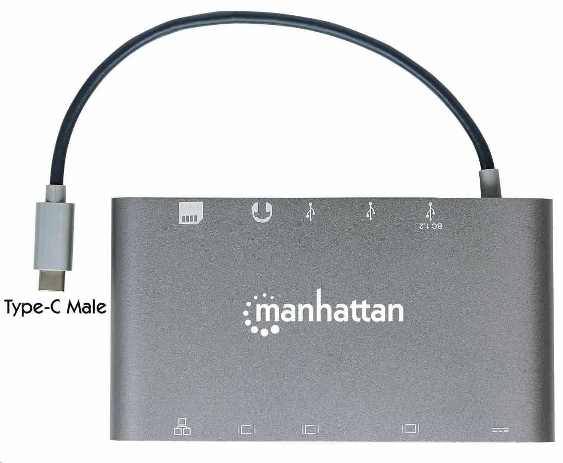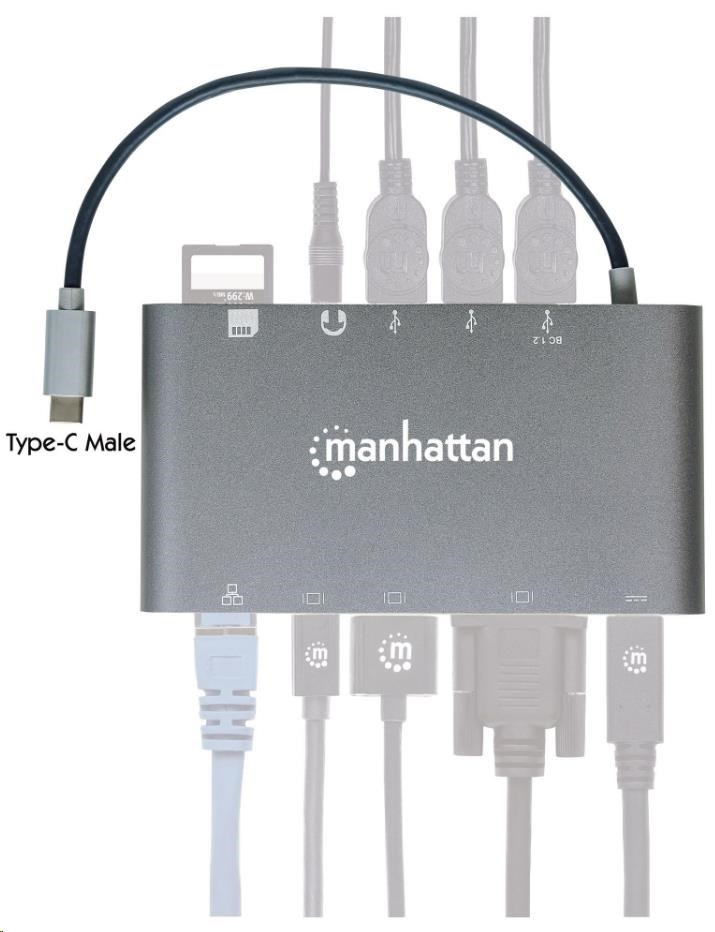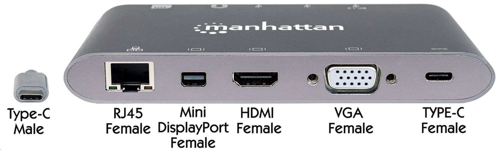 MANHATTAN Dokovací stanice USB-C 7v1, 1xHDMI, 1xVGA, 1xUSB-C,3xUSB, 1xRJ45, 1x3.5mm, šedá