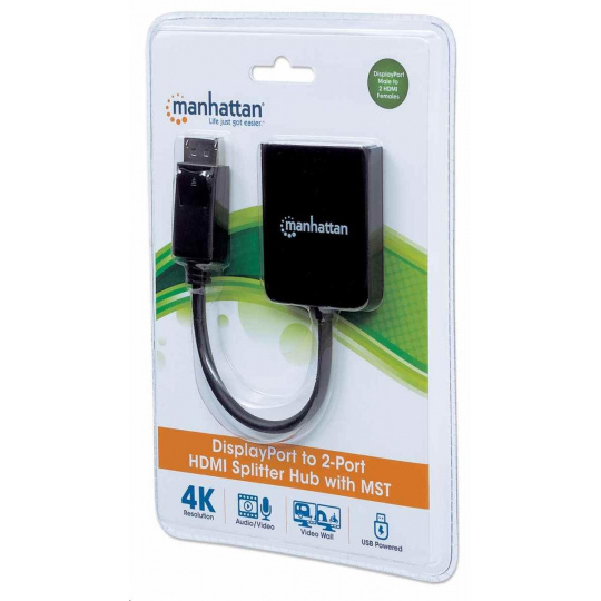 The Manhattan DisplayPort to Dual HDMI - MST Hub streams a 4K DisplayPort (DP) signal from a single UHD source to up to two UHD HDMI displays.