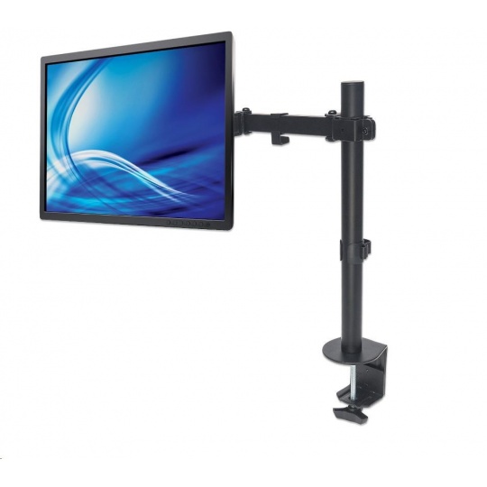 LCD-monitor installation above the desk helps maximize the effectiveness of a potential workspace. The Manhattan Universal Monitor Mount with Double-Link Swing Arm improves organization on the desktop, making it easier to get work done on the computer.