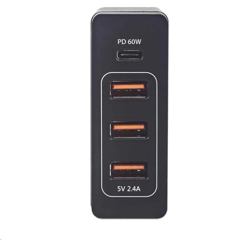 One USB-C Power Delivery Port up to 60 W, Three USB-A Charging Ports Sharing up to 12 W / 2.4 A, Black
