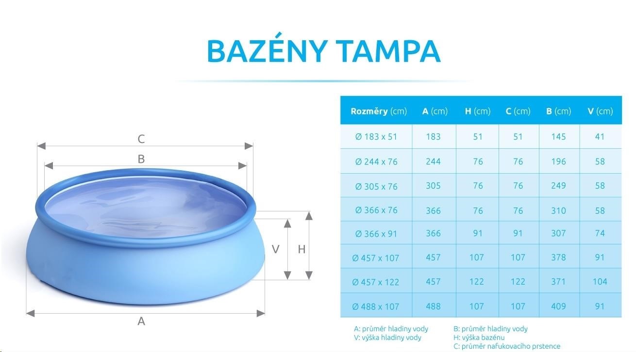 Bazén Tampa se řadí mezi neprodávanější a nejoblíbenější bazény v České republice. Koupání ve vlastním bazénu si může dopřát opravdu každý. Předností bazénu Tampa je nízká cena, snadná údržba i rychlé zprovoznění. Stačí jen připravit místo na bazén, rozvinout bazénovou podložku, bazén rozbalit, nafouknout horní límec a začít napouštět vodu. Stoupající voda sama bazén postaví. Od vybalení bazénu můžete do 10 minut napouštět vodu. Bazén je nutné po skončení bazénové sezony vyčistit, vypustit a uklidit na suché, nemrznoucí místo. Správnou údržbou prodloužíte životnost bazénu. Doporučujeme bazén po koupání zakrývat krycí plachtou. Pro snadné nafouknutí doporučujeme zakoupit ruční či elektrickou pumpu.