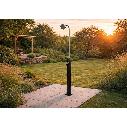 Solární sprchy se dají využívat samostatně, ale můžou tvořit i doplněk k bazénům. Pomáhají tak před zbytečným znečištěním bazénové vody například od trávy či hlíny.