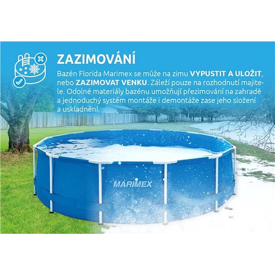 Bazén Florida Marimex můžete zazimovat a ponechat venku, nebo ho vypustit a složit. Pokud se rozhodnete uložit ho, bazén je potřeba vypustit, umýt od nečistot, osušit a uložit na suché místo, kde nemrzne. Je vhodné ho v průběhu zimy občas přeskládat, aby ve folii nevznikaly přehyby. Pokud se bazén rozhodnete ponechat na zahradě, je potřeba upustit vodu, odpojit filtraci a další příslušenství a do bazénu aplikovat chemické přípravky pro zazimování bazénu.
