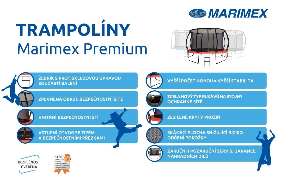 Trampolína Marimex Premium je skvělým doplňkem každé zahrady. Děti skákání na trampolíně milují a při skákání si snadno zacvičí i dospělí - nosnost je až 150 kg. Dokonalou stabilitu zajišťují čtyři nohy ve tvaru písmene U..... více