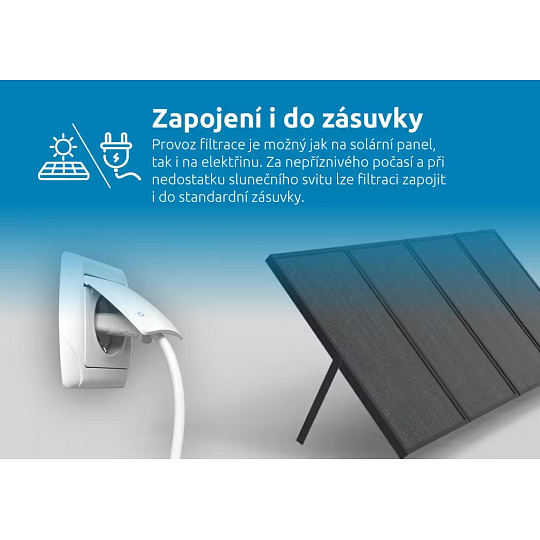 Provoz filtrace je možný jak na solární panel, tak i na elektřinu. Za nepříznivého počasí a při nedostatku slunečního svitu lze filtraci zapojit i do standardní zásuvky.