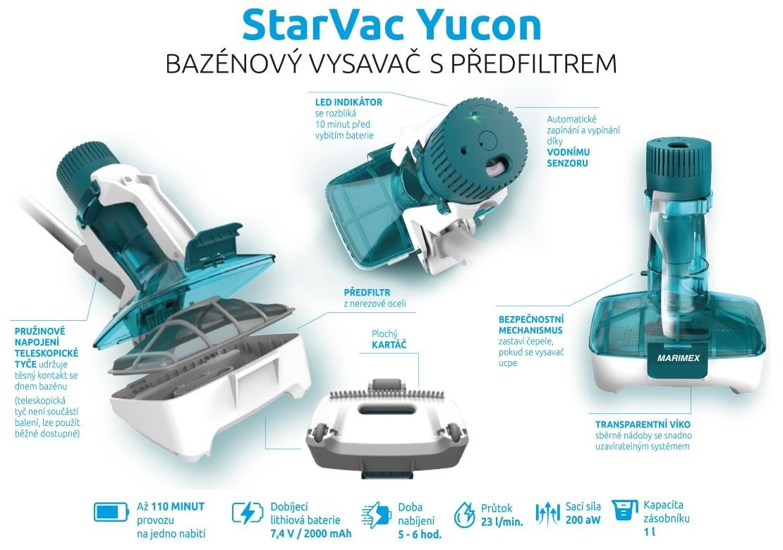 Bezdrátový a přenosný bazénový vysavač Marimex StarVac Yucon je vhodný pro nadzemní i zapuštěné bazény do průměru 4,57 m. Vysavač disponuje automatickým zapínáním a vypínáním díky vodnímu senzoru. Výhodou je i LED indikátor, který vás upozorní na vybití baterie. Vysavač Yucon vydrží pracovat téměř 2 hodiny na jedno nabití.