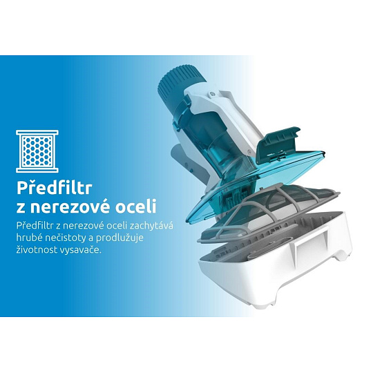 Díky transparentnímu víku sběrné nádoby máte vždy přehled o stavu naplnění, zatímco plochý kartáč na spodní straně vysavače zajišťuje efektivní čištění. Předfiltr z nerezové oceli navíc zachytí hrubé nečistoty a prodlužuje životnost vysavače.