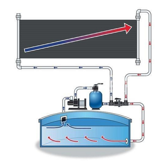 Toto rozdělení v podstatě funguje jako vypínač, či regulátor solárního ohřevu, kdy se přes ventil odkloní tok vody a proudí tak přímo zpět do bazénu. Pokud tedy na noční filtrování bazénu chcete solární ohřev "vypnout", neboť v nočních hodinách má solární ohřev opačný efekt a bazénovou vodu spíše ochlazuje, doporučujeme použít právě náš kulový ventil..