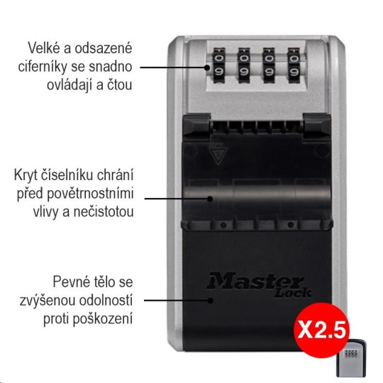 - Zvýšená kapacita úložiště – až 2,5x větší kapacita. Kapacita schránky je přibližně 2,5násobkem kapacity standardní schránky na klíče. Umožňuje bezpečné uložení až 10 klíčů (klíčenky, karty a velké klíče).