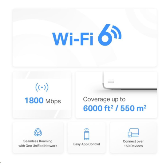 - Dvoupásmové Wi-Fi 6 připojení s rychlostí až 1 800 Mbit/s – 1 201 Mbit/s v pásmu 5 GHz + 574 Mbit/s v pásmu 2,4 GHz.